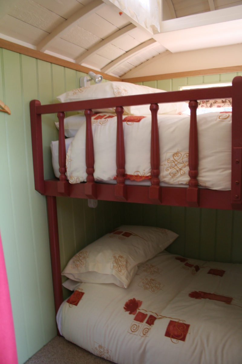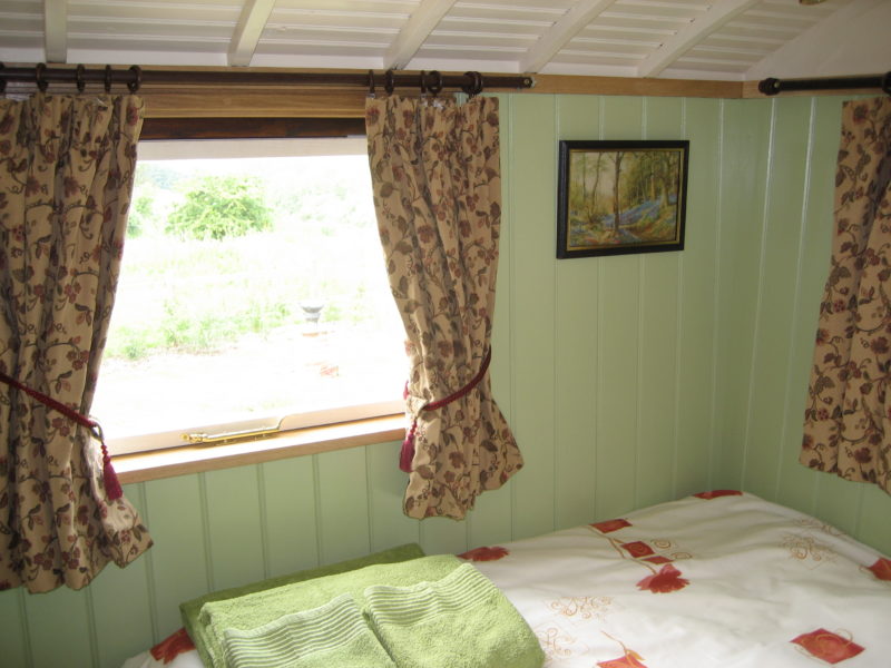 The showmen of the past would love what we’ve done with the place! While still distinctly a showman’s wagon, it has all the mod-cons you’d expect from a modern holiday let. The centre of the wagon is the living and dining area, with wrap-around bench seating and a fully-equipped kitchenette. There is a small TV and radio in this sitting/dining area.