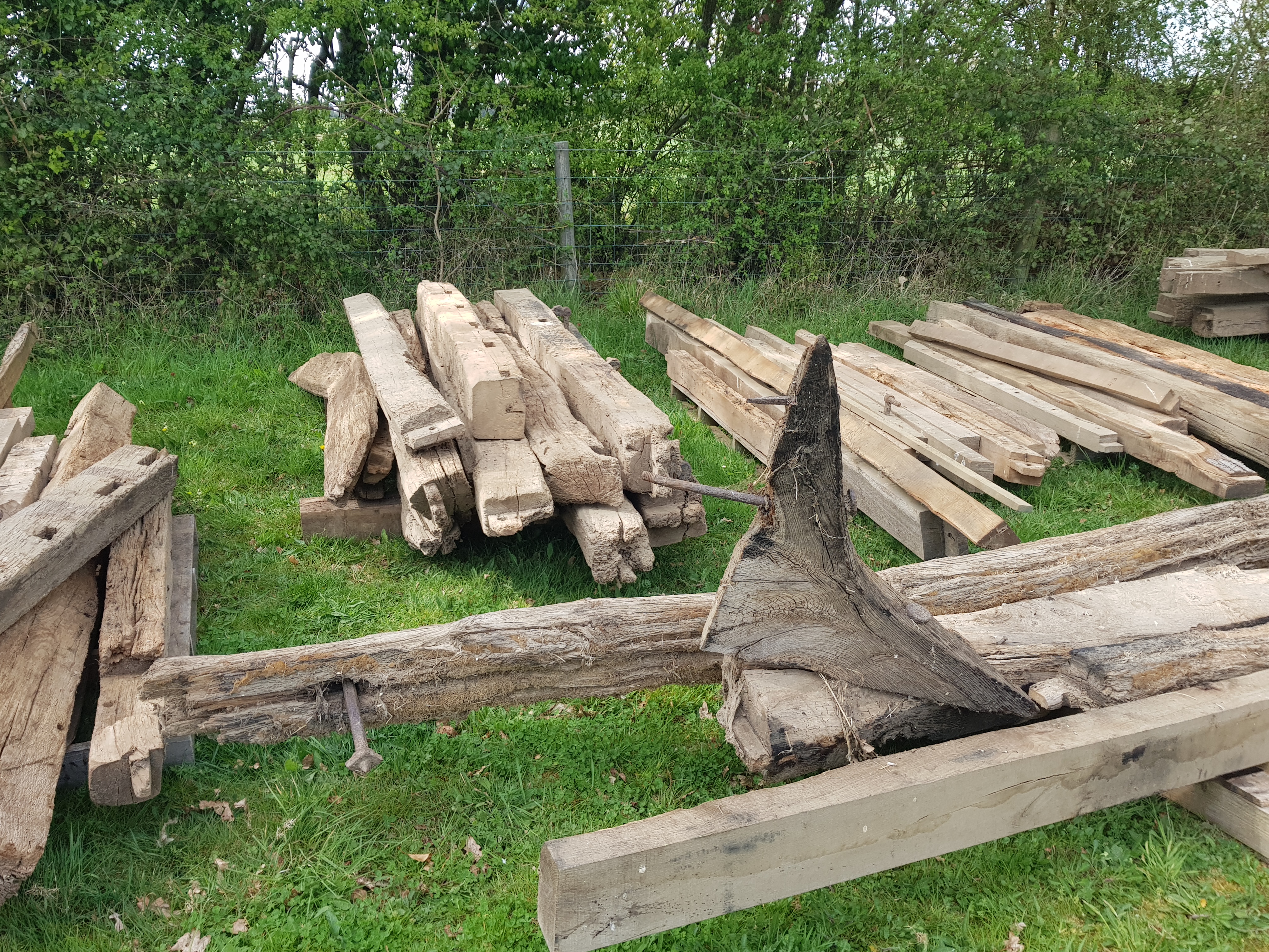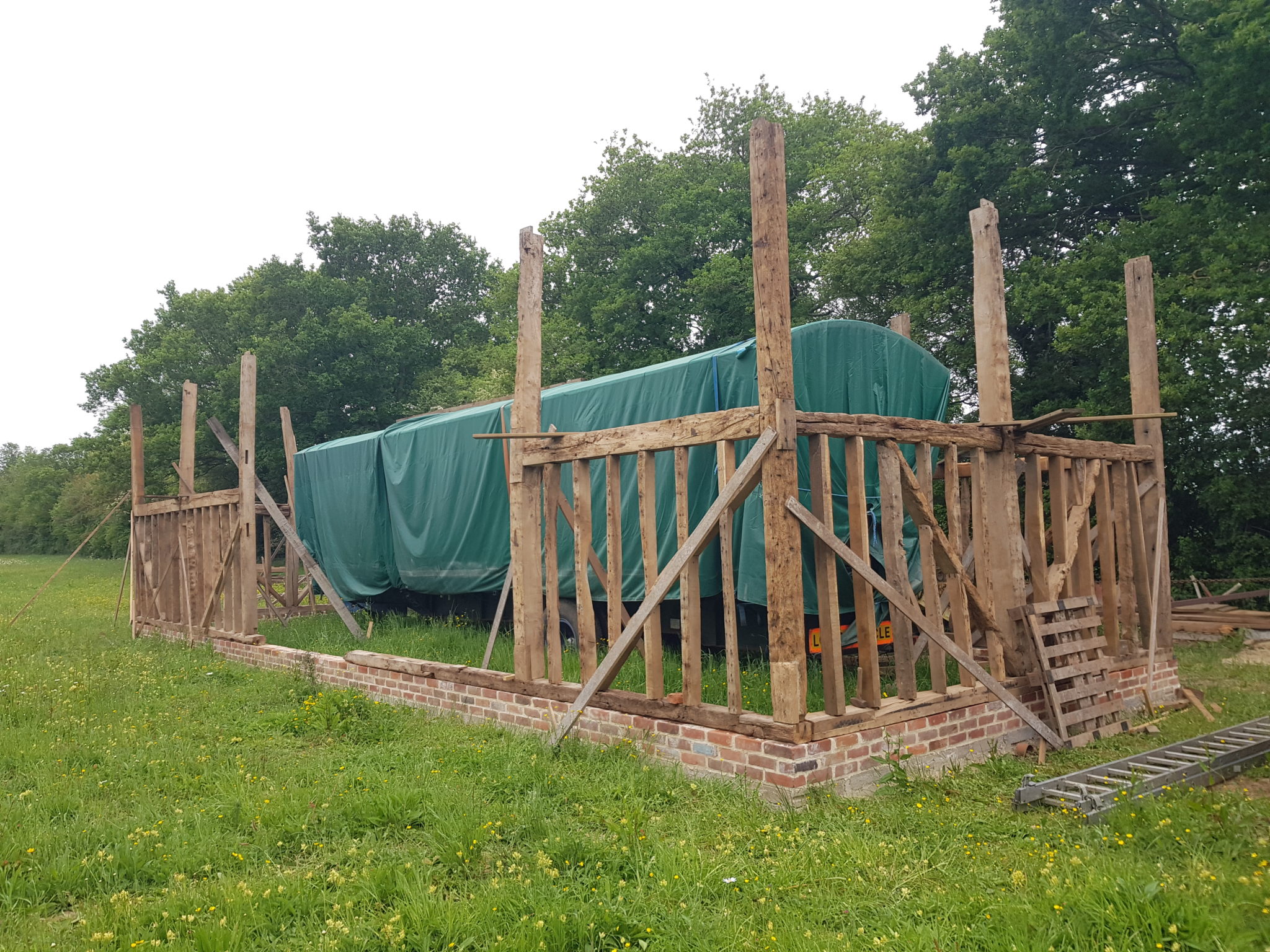 Maudies Carriage is now situated on our Montagues Farm site. Restoration is in progress! Currently the ancient barn frame that will house the Carriage is being re-constructed piece by piece. When the Ancient Essex Barn originally blew down in 1987 John had the foresight to label each piece and outline them on drawings ready for the day when it could be rebuilt. John and son Ben have been looking forward to this project and are hard at work on construction this summer.